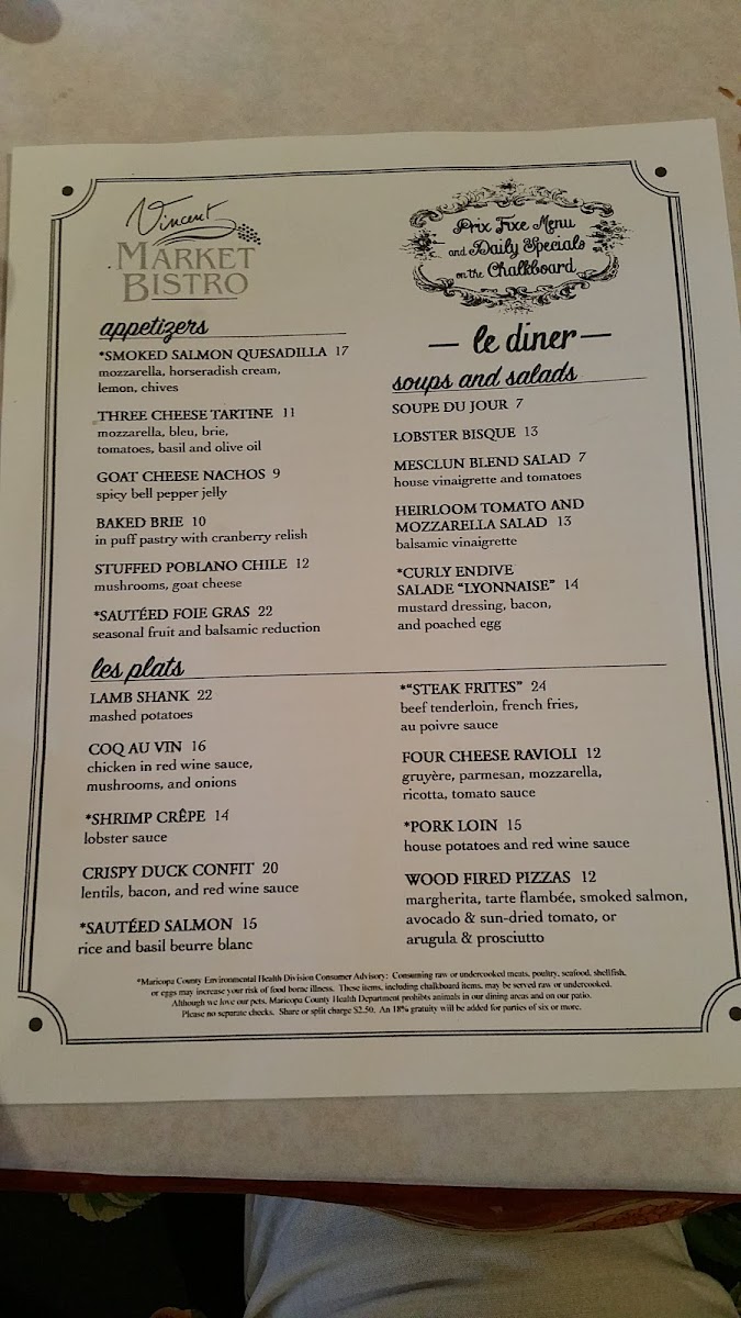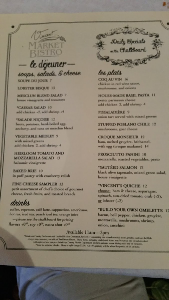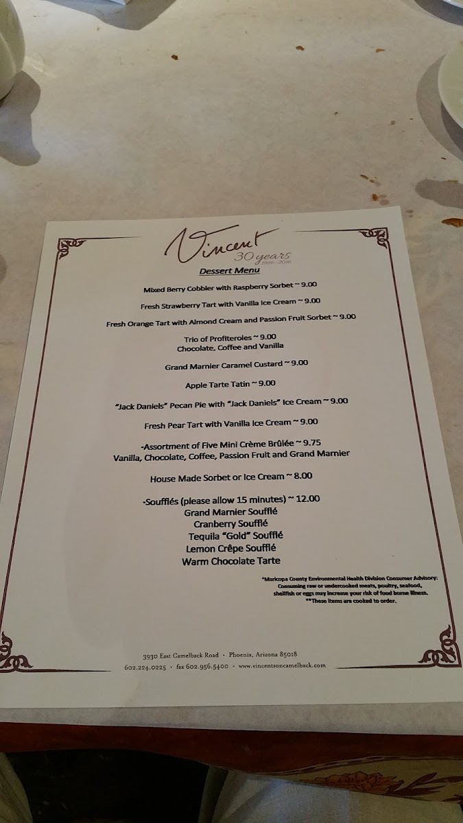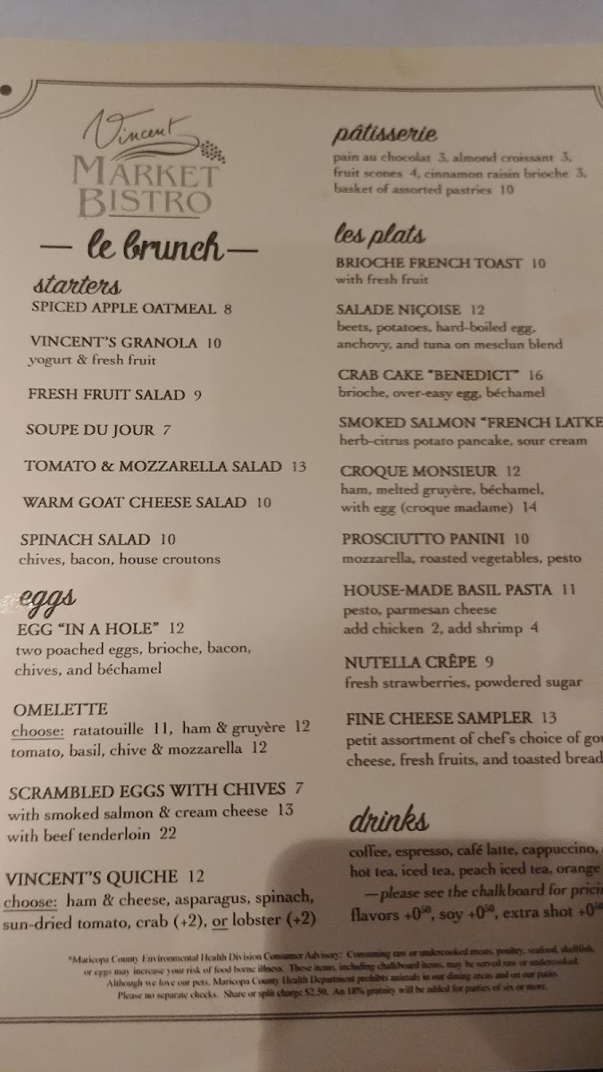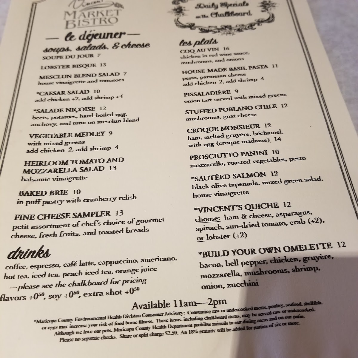 Dessert provides a satisfying finale, with highlights like Mixed Berry Cobbler With Raspberry Sorbet, Fresh Strawberry Tart With Vanilla Ice Cream, Fresh Orange Tart With Almond Cream And Passion Fruit Sorbet, Trio Of Profiteroles, and Grand Marnier Caramel Custard. Overall, Vincent Market Bistro’s menu comes together as a cohesive, elegant summary of French-inspired cuisine-perfectly suited for guests seeking quality, tradition, and a quietly sophisticated dining experience in Phoenix.